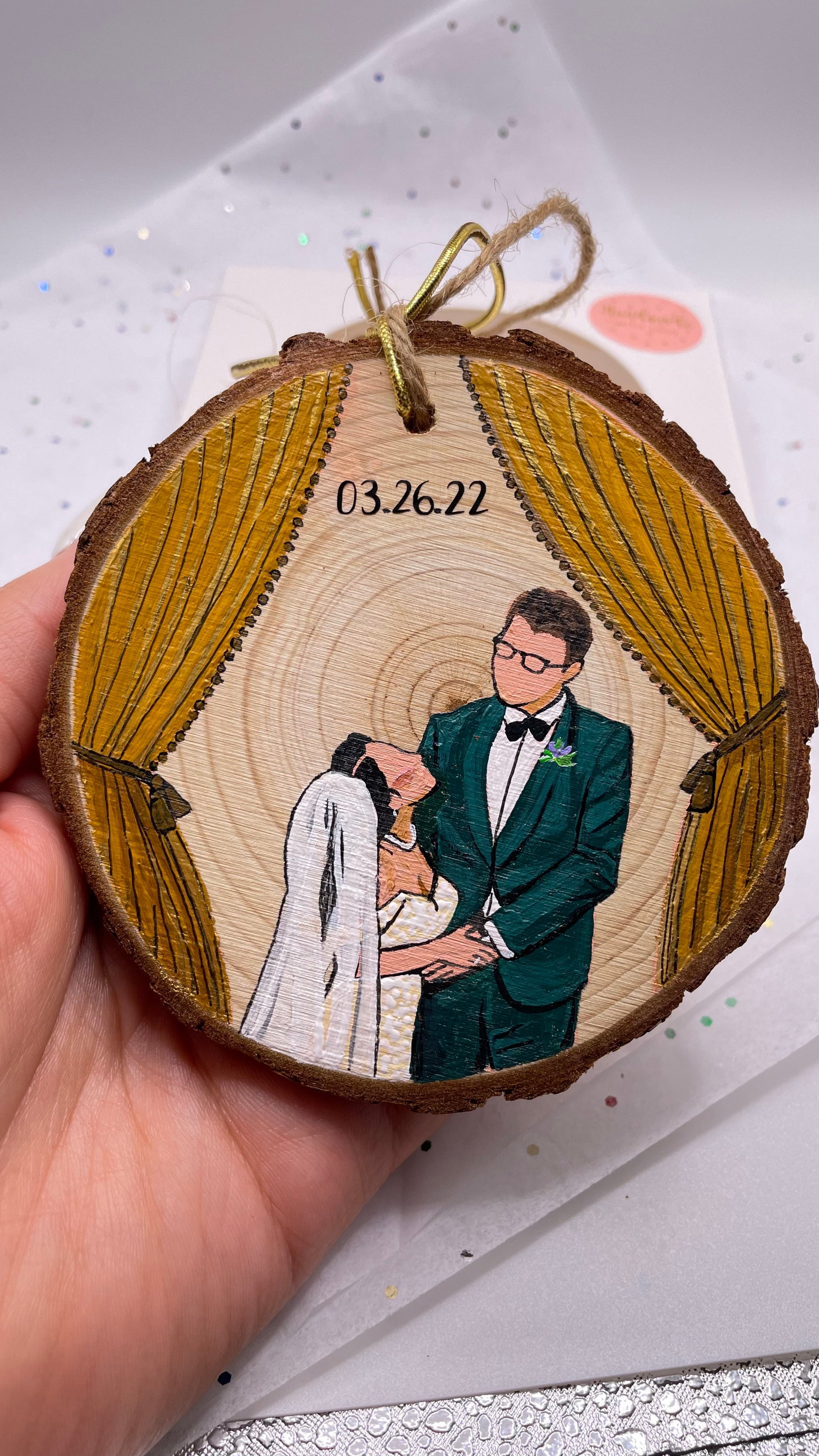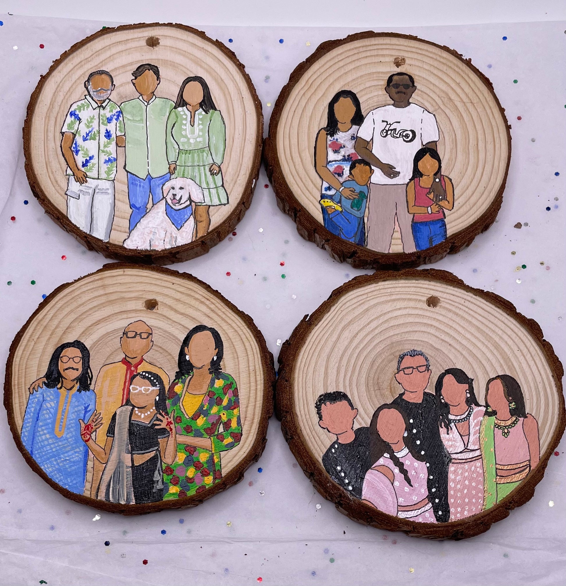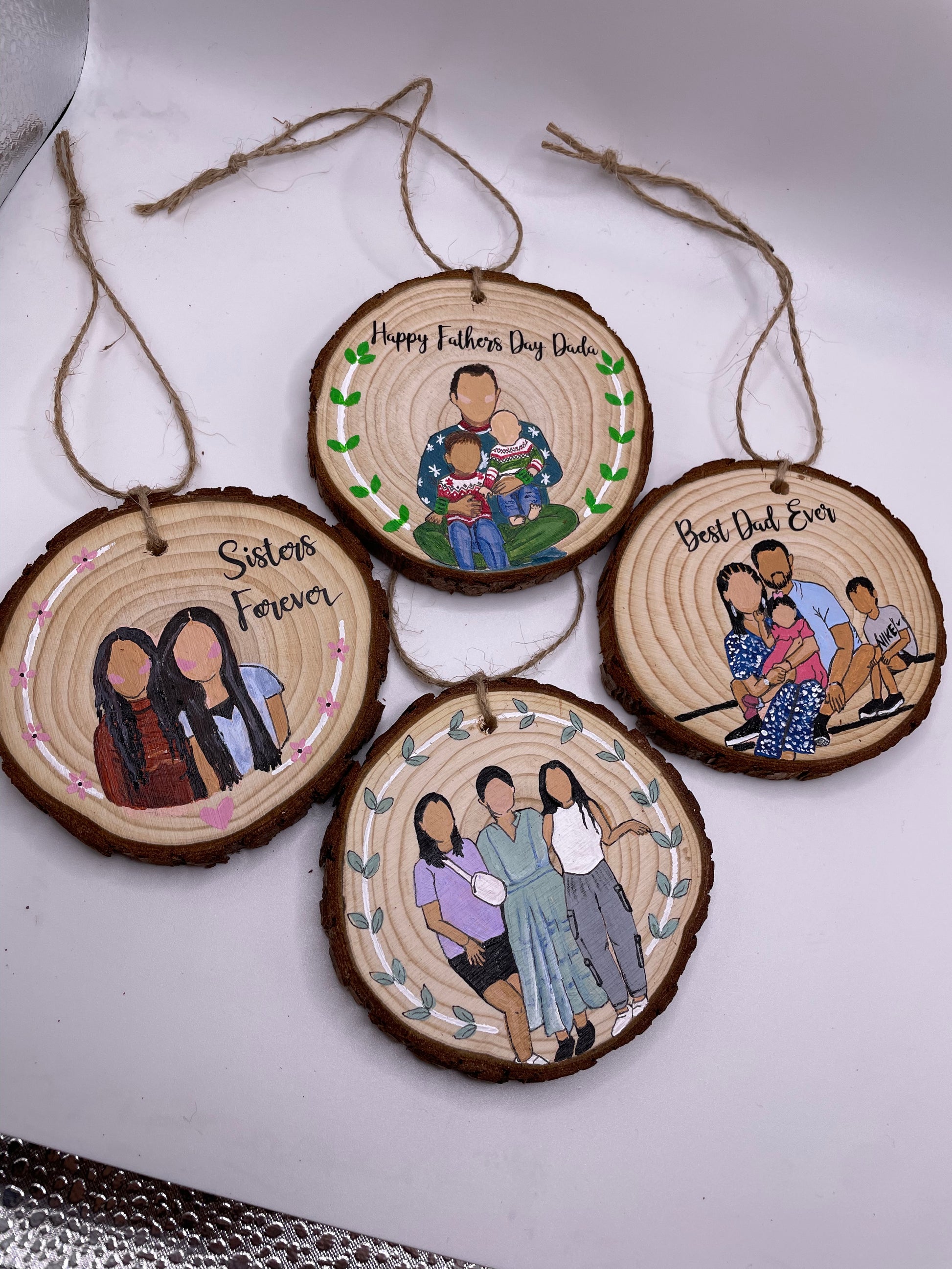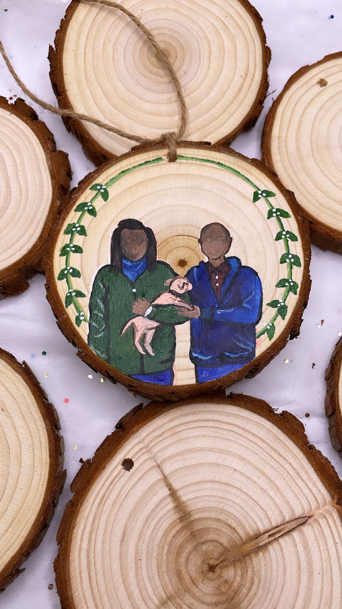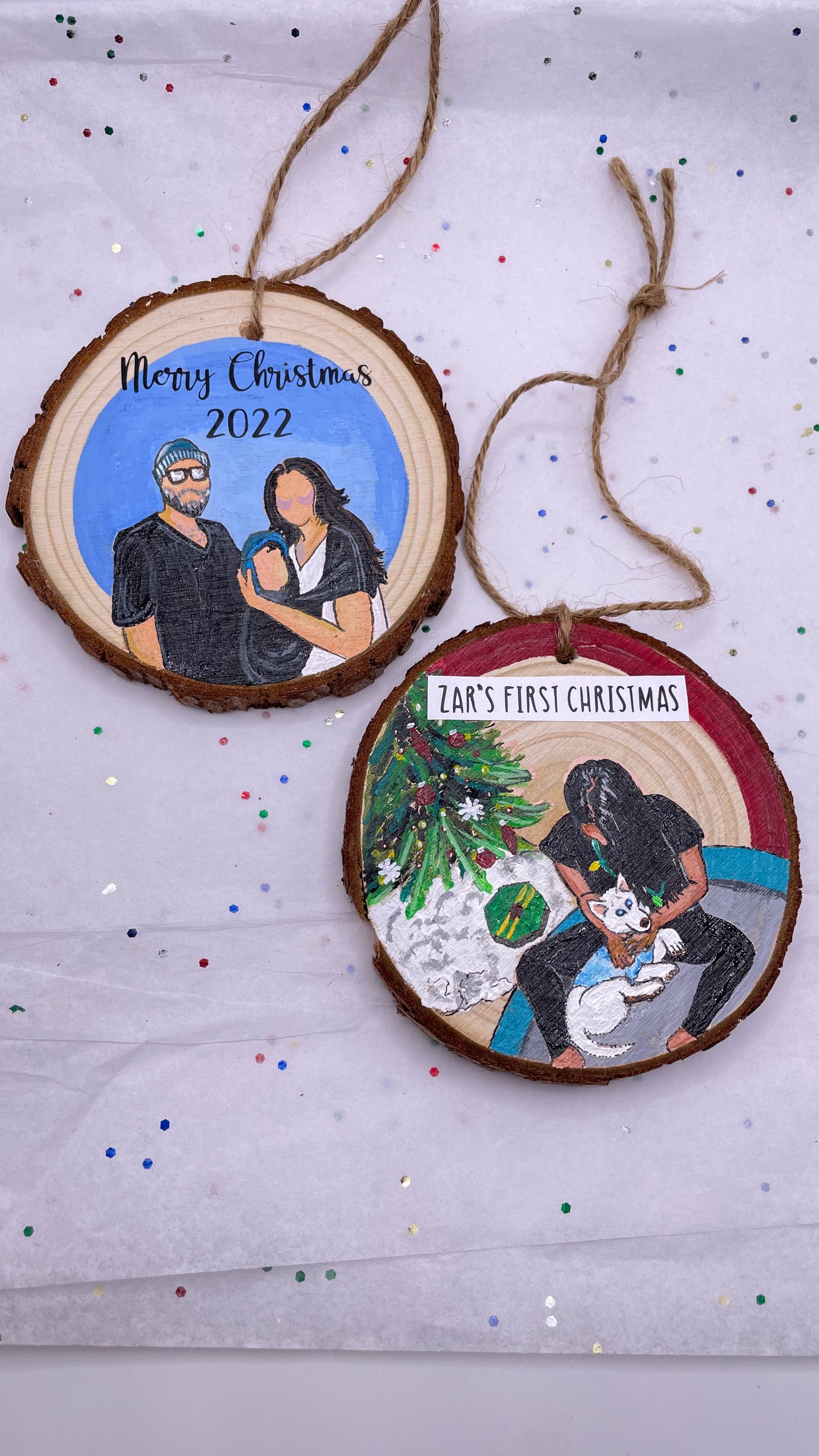 Each portrait is hand painted with acrylic paint and made to order. They are painted on natural wood slice ornaments, ready to hang on your tree, stick on a fridge, display on a desk/shelf/wall, or gift to a friend or family member. FREE SHIPPING!